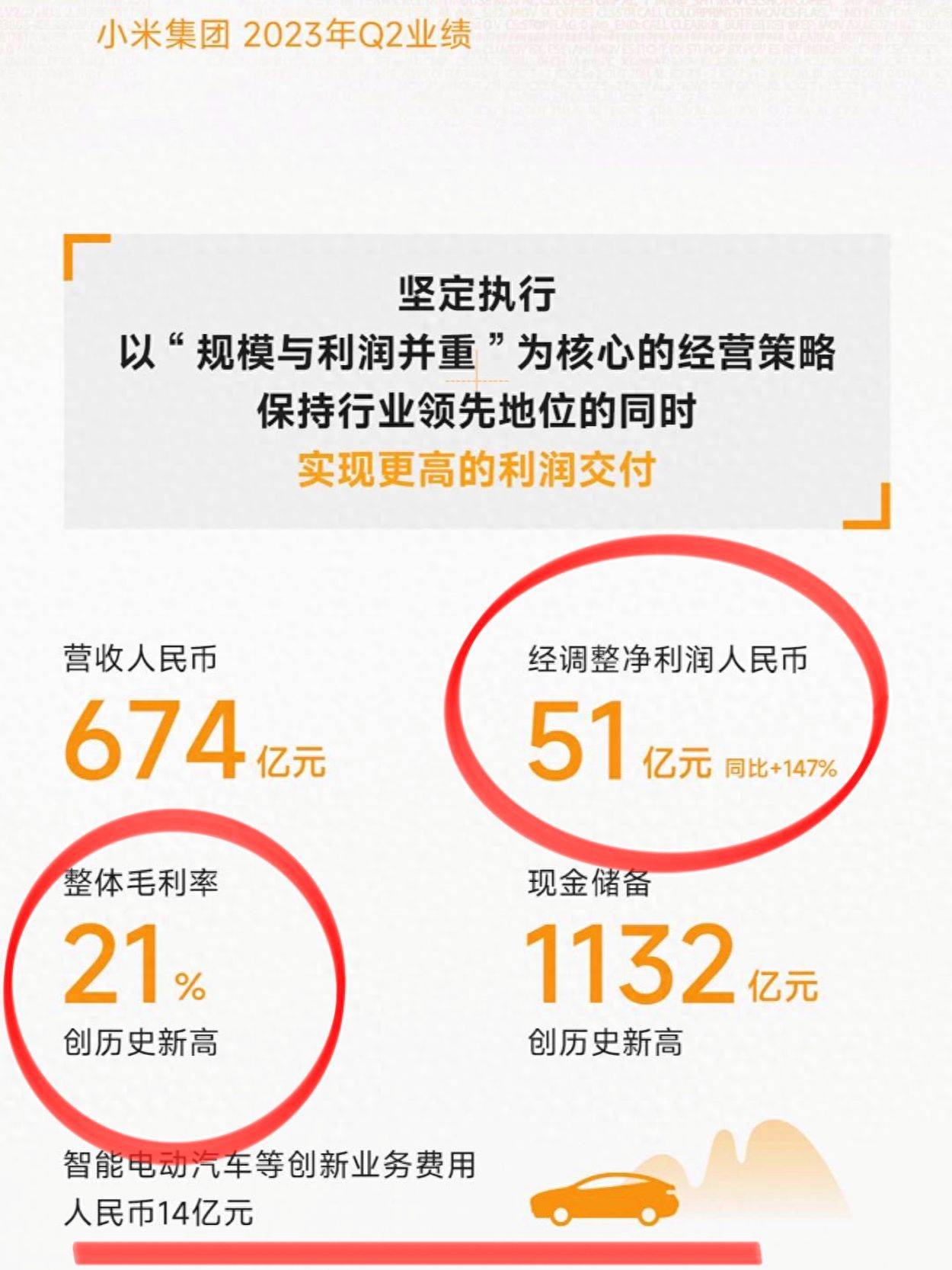 我们先不说雷军为什么要做高端,先来说这三年来小米做高端的成果怎么样。从小米集团最新公布的2023年第二季度财报来看,本季度净利润达到了51亿,同比增长147%,创新高的毛利率和调整后的净利润都远超上市时的小米。可见,这波高端化战略确实是让小米更好了。
