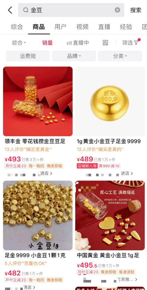 记者则注意到,近期火爆的“金豆豆”在多个网店中的售价都低于国内金价,甚至还可以叠加优惠券付款。对此,业内人士向记者表示,远低于市场价格的黄金容易藏有猫腻,消费者需在克重、材质上多做确认和了解,选择有保障的店铺购买。