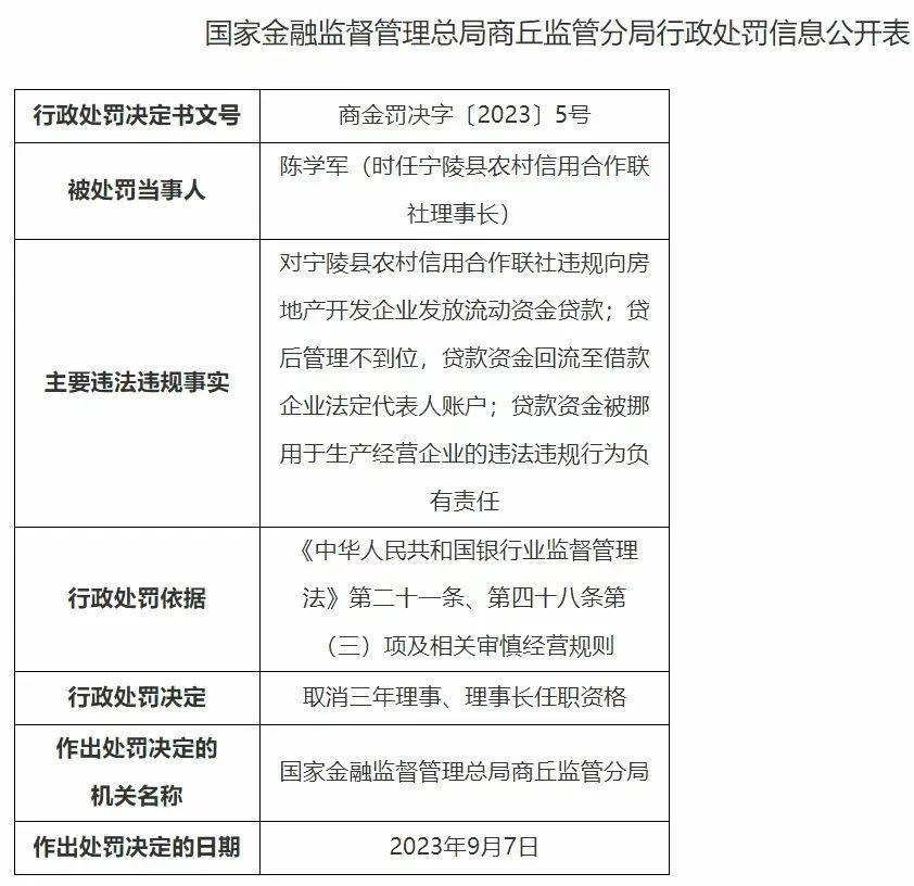 9月15日消息,宁陵县农村信用合作联社日前被国家金融监督管理总局商丘监管分局罚款120万元。