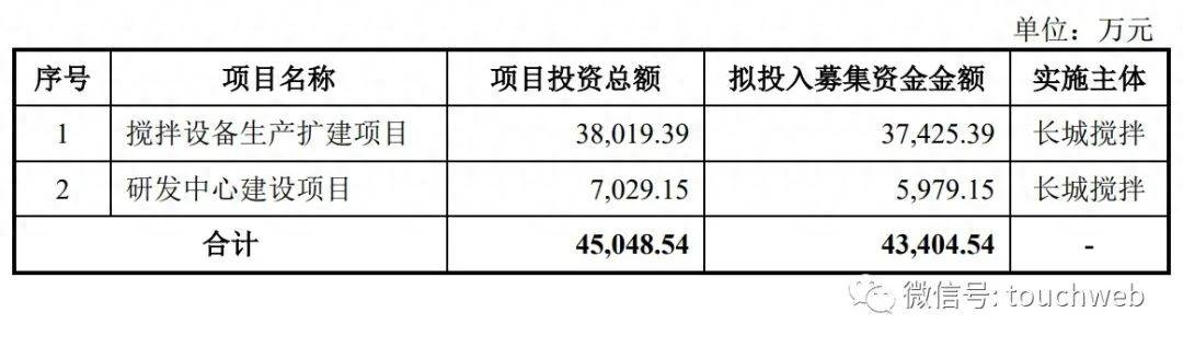 长城搅拌计划募资4.34亿元,其中,3.74亿元用于搅拌设备生产扩建项目,5979万元用于研发中心建设项目。