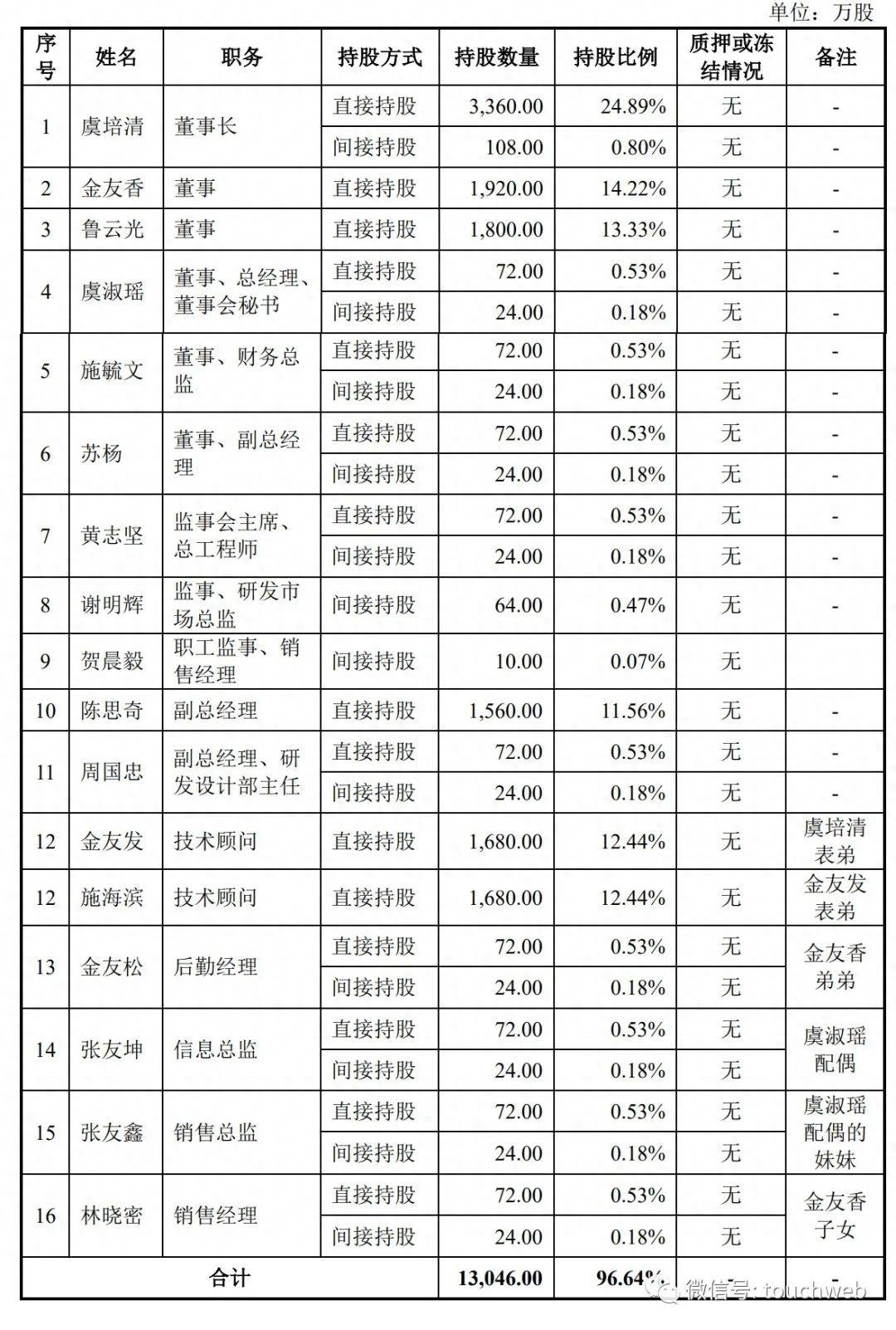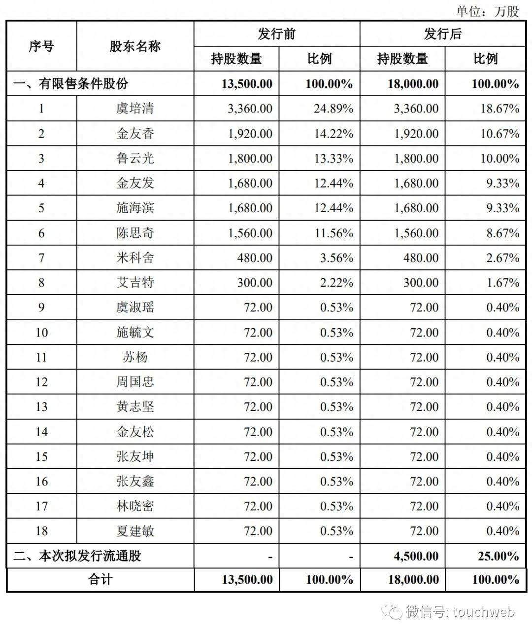 IPO后,虞培清持股为18.67%,金友香持股为10.67%,鲁云光持股为10%,金友发、施海滨分别持股为9.33%,陈思奇持股为8.67%,米科舍持股为2.67%,艾吉特持股为1.67%;