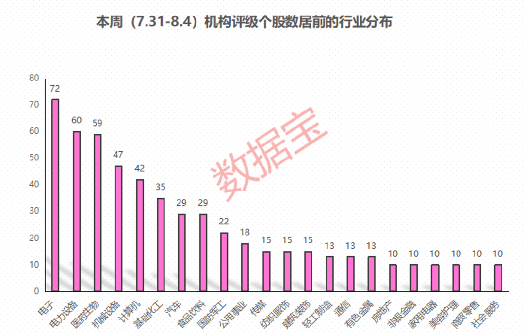 从申万一级行业来看,电子行业有72股获评级,位居首位;电力设备有60股,次之;医药生物有59股上榜,排名第三。