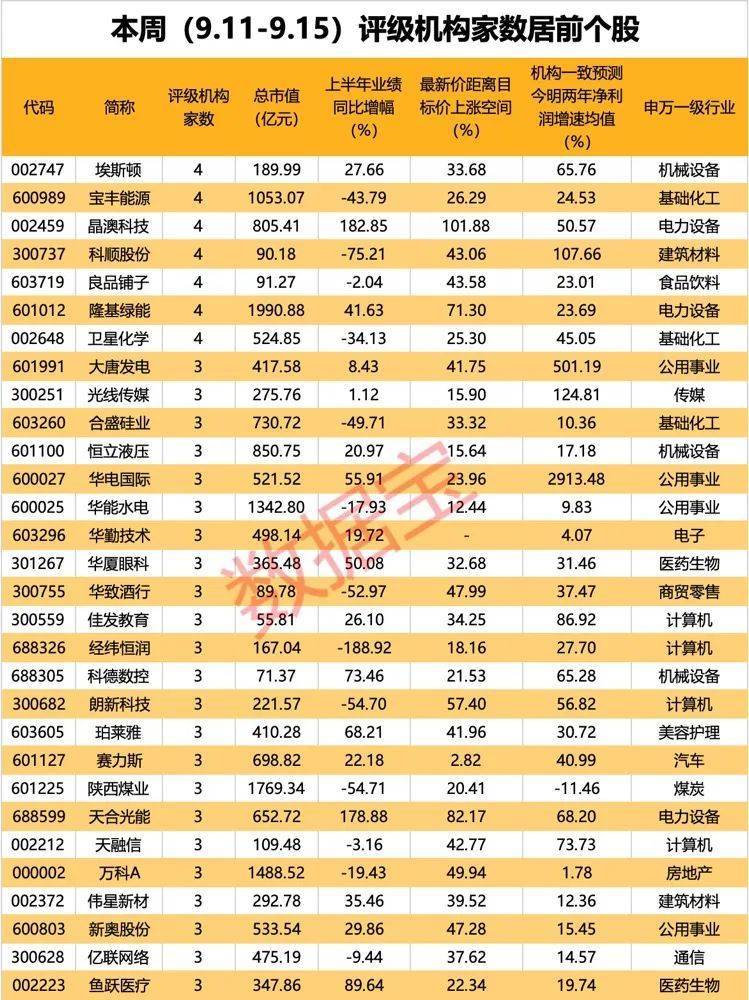个股方面,30股获3家及以上机构“买入型”评级。埃斯顿、宝丰能源、科顺股份等7股获4家机构参与评级,其中光伏组件龙头企业晶澳科技和天合光能获评较多关注。