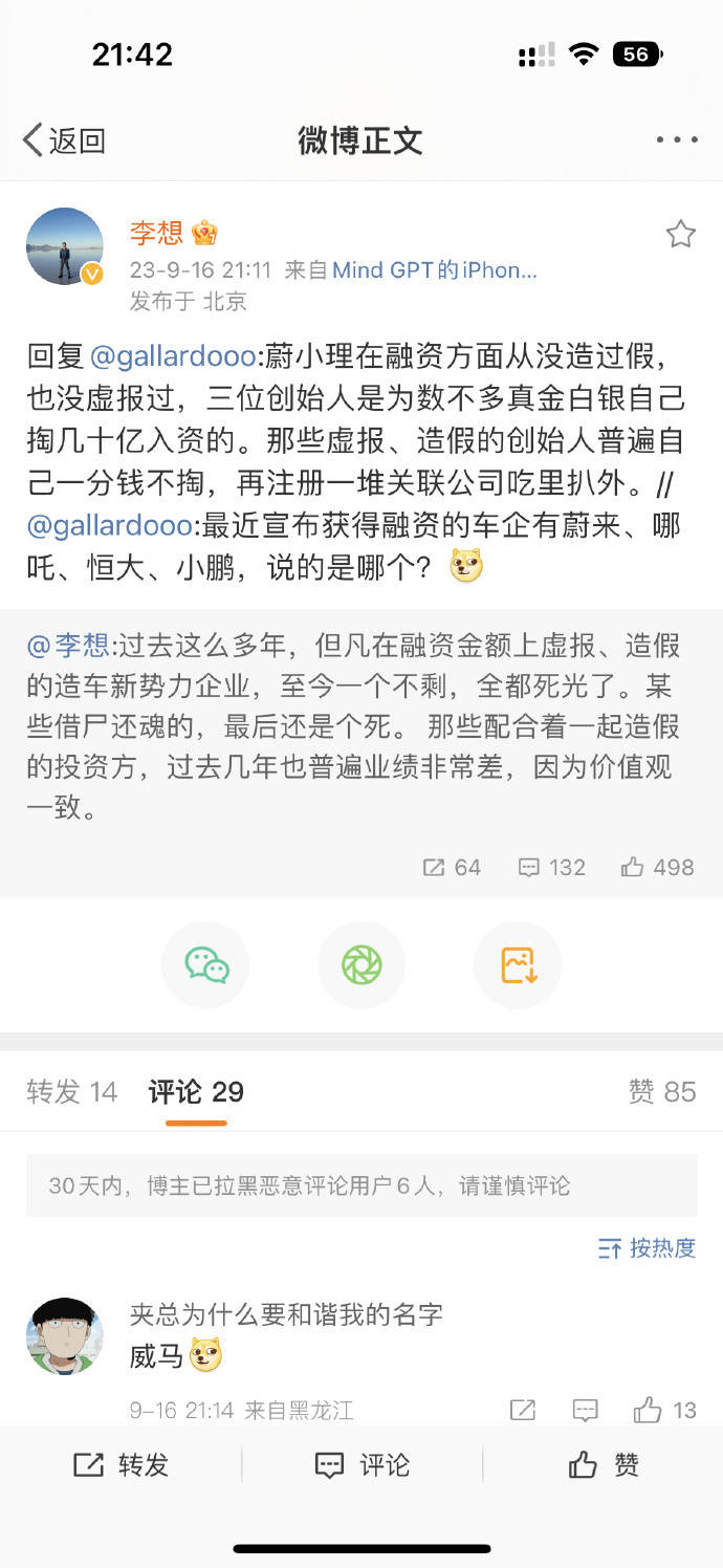 李想被网友热议的原文为,蔚小理在融资方面从没造过假,也没虚报过,三位创始人是为数不多真金白银自己掏几十亿入资的。那些虚报、造假的创始人普遍自己一分钱不掏,再注册一堆关联公司吃里扒外。