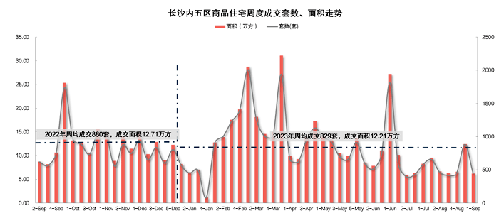 不过从成交上看,长沙新房的火爆程度并不及预期。据湖南中原数据监测,9月第1周(9月3日至9月9日)长沙新建住宅成交量439套,环比下滑约50%,远不及2023年周均成交量829套。
