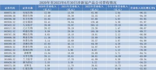 比如依靠新冠检测实现营收大增的安旭生物,2022年营收达到了61.66亿元,而今年上半年营收只有2.04亿元,同比下降了96.55%,安旭生物在年报中也解释称,全球对新冠产品需求的大幅度减弱,公司较同期新冠产品的订单下降,导致公司2023年上半年经营业绩呈现下降。