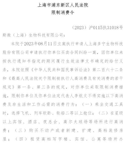9月15日,据财新报道,斯微(上海)生物科技有限公司(下称“斯微生物”)因与上海多宁生物科技有限公司(下称“多宁生物”)的买卖合同存在纠纷,未按执行通知书指定的期间履行给付义务,斯微生物及公司法定代表人李航文被限制高消费。