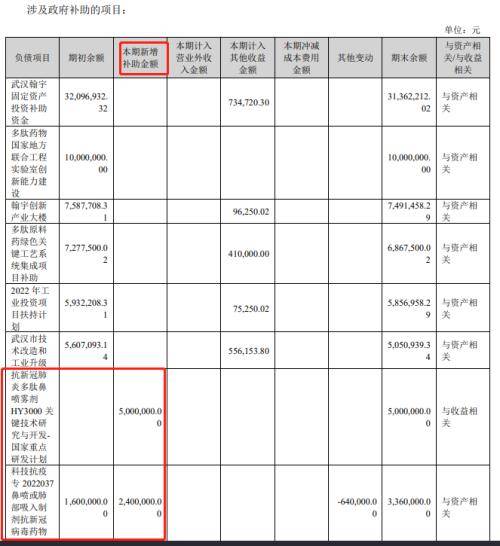 此外,今年上半年,翰宇药业抗新冠肺炎多肽鼻喷雾剂HY3000关键技术研究与开发国家重点研发计划和科技抗疫专2022037鼻喷或肺部吸入制剂抗新冠病毒药物研发分别获得了500万元和240万元的的政府补助。