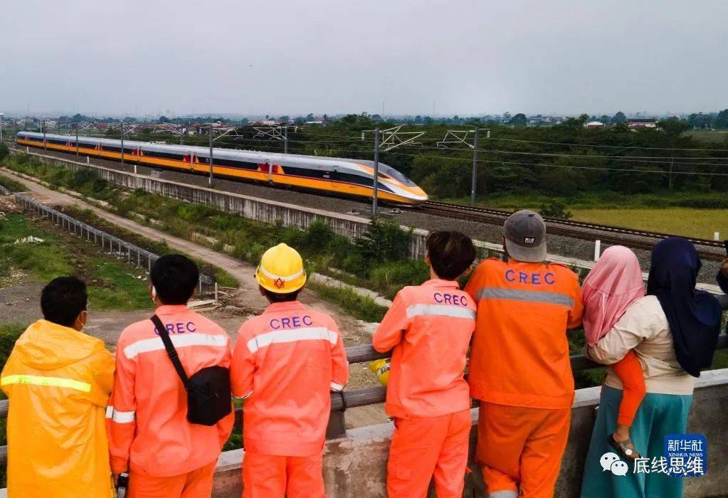 2022年11月16日,在印度尼西亚万隆,雅万高铁建设者和当地民众观看高速铁路综合检测车行驶在雅万高铁试验段。(图/新华社)