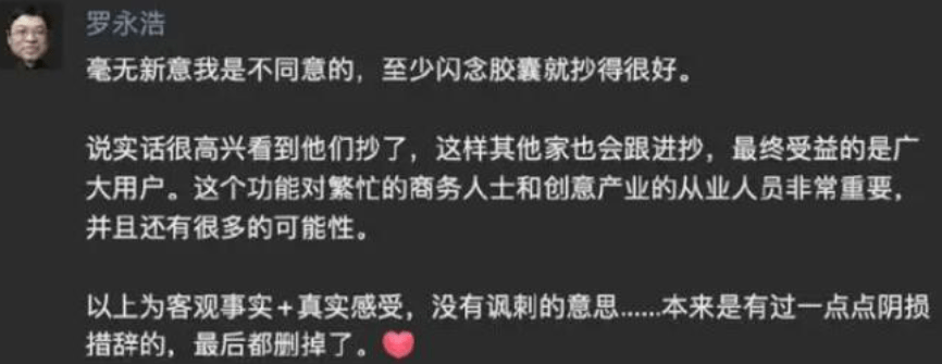 罗永浩彼时评价称,不认为苹果毫无新意,至少闪念胶囊就抄得很好。说实话很高兴看到他们抄了,这样其他家也会跟进抄,最终受益的是广大用户。罗永浩认为,这个功能对繁忙的商务人士和创意产业的从业人员非常重要,并且还有很多的可能性。