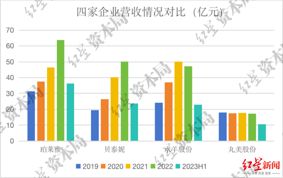 从四家企业营收规模来看,目前珀莱雅营收规模最大,今年上半年企业实现营收36.27亿元。贝泰妮和水羊股份营收规模相近,目前四家企业中丸美股份营收规模最小,今年上半年营收为10.59亿元。