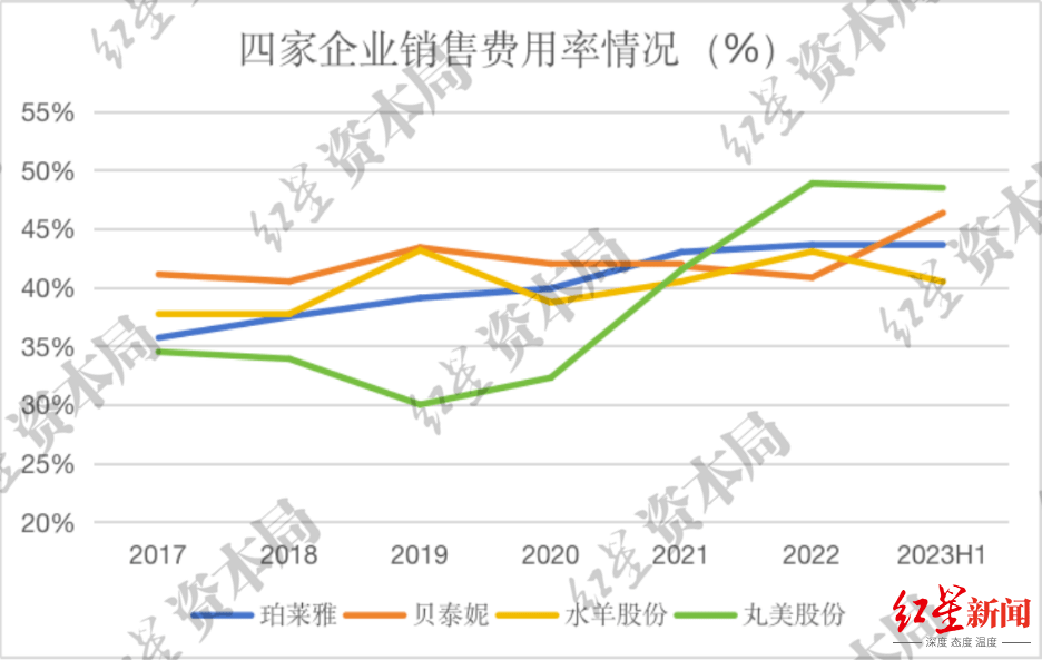 2023年上半年,珀莱雅销售费用为15.8亿元,同期贝泰妮、水羊股份、丸美股份的销售费用分别为10.9亿元、9.2亿元、5.1亿元。