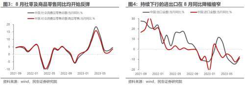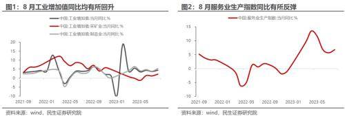 8月国内经济数据全面修复,经济向上的迹象较为明显。本周(2023年9月11日-9月15日,下同)密集公布了大量经济数据,经济边际修复向上的信号较为明显,“三架马车”见底企稳,甚至有所抬升。制造业及服务业生产同比增速回升,尤其是服务业在经历了一个季度的下行后,首次出现反弹迹象。工业增加值方面,不论是上游的采矿亦或是中游制造业同比增速近几个月企稳趋势较为明显。消费端,社零同比增速持续下行后有所反弹,尤其是商品零售。进出口来看,2022年下半年以来,海外需求持续走弱,尽管23年年初出口在海外韧性下超预期改善,但二季度随着全球制造业活动走向下行,8月进出口同比降幅的缩窄较为明显,海外需求的边际企稳对国内出口有所推动。融资及投资的意愿亦有所回温,社融及信贷同比增速小幅反弹,制造业投资完成额的下行阶段似乎告一段落。整体来看,8月经济数据的全面修复似乎暗示着国内经济正在企稳,甚至是临近拐点,往后看,向上的概率和空间似乎更大。