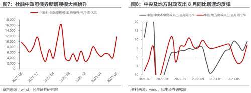 政策发力支持经济,财政支出明显上升。8月社融规模中政府债券新增发行量大幅上升,为近一年来新高。地方财政支出同比连续两个月有所改善,中央则首次出现反弹。专项债发行节奏明显加快,三季度之前地方政府需落实剩余的专项债额度,对经济形成支撑,进一步提振需求上行。