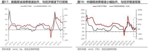 商品消费增速似乎已经领先经济抬升,往后难以走弱。年初至今,美国原油消费增速相对于经济增速出现背离,原油消费增速持续上行,而经济增速则明显回落,然而历史上两者正相关性偏强。同样的,中国铜消费增速与经济增速从年初开始也出现了背离。