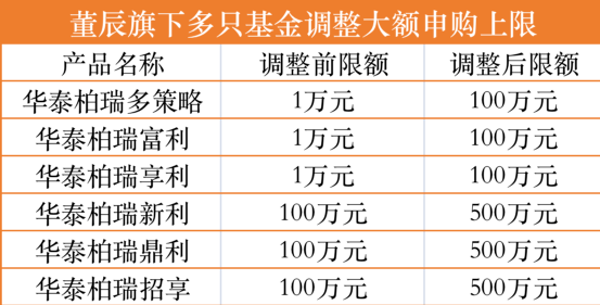 具体来看,主动权益基金中的华泰柏瑞多策略基金自2023年9月18日起,大额申购(含转换转入、定期定额投资)业务限制金额由1万元调整为100万元。