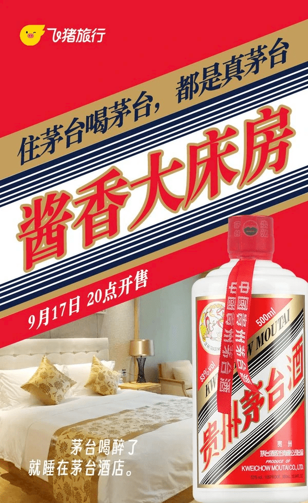 IT之家注意到,近日阿里巴巴集团旗下旅行平台飞猪宣布,将在 17 日晚 8 点开售茅台酒店酱香大床房,价格为 999 元。该价格含三亚茅台酒店 1 晚 + 双人早餐 + 正餐晚餐 + 茅台红酒 1 瓶 + 现场品鉴 53 度飞天茅台 500ml 一瓶。飞猪强调,这是 10 月 1 日国庆当天的酱香价。按照飞猪发布的信息,此次特价包括酒店的餐饮和现场品鉴飞天茅台。查询发现,该酒店大床房型平时不含飞天茅台,价格 600 元左右。值得注意的是,飞猪海报在活动规则处注明,999 元入住套餐只有 10 个专享名额,2999 元高级 / 大床房 2 晚套餐则没有标注名额限制。