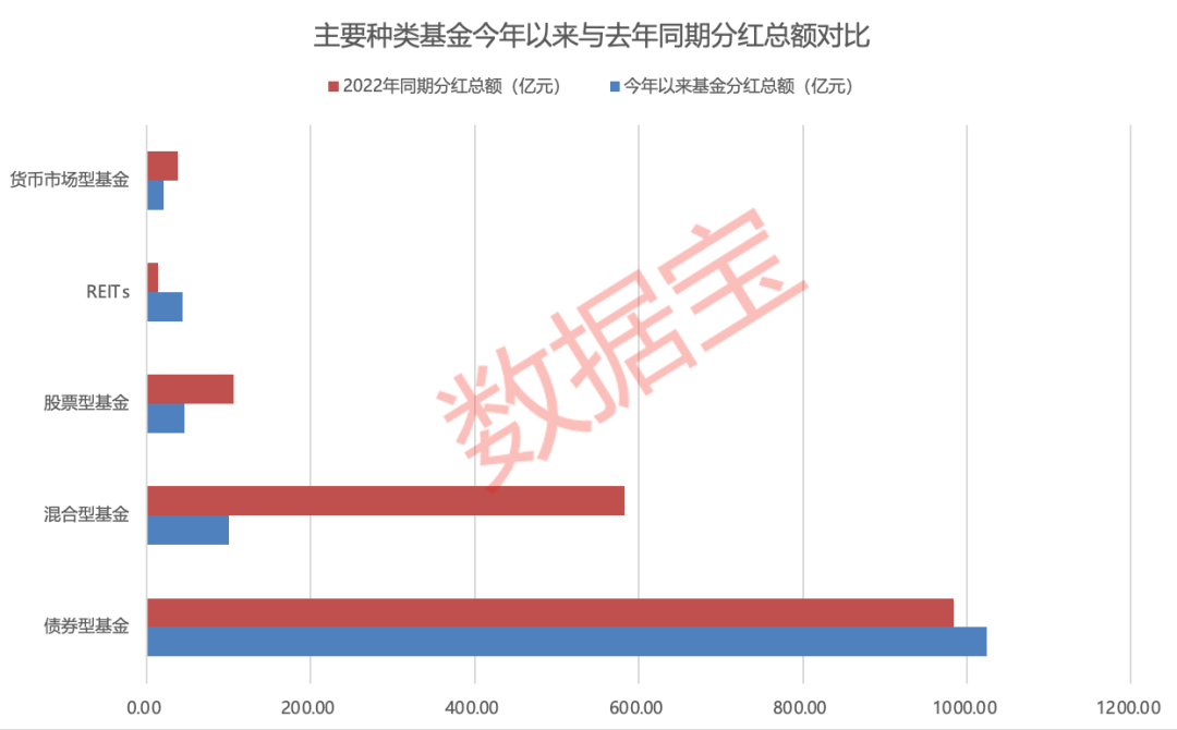 与去年同期相比,仅债券型基金和REITs基金分红总额有所上升。统计显示,今年以来共有1880只债券型基金合计进行3205次分红,累计分红总额达到1024.36亿元,占全部基金分红总额的82.92%,是基金分红的绝对主力军。混合型基金分红居于其后,合计分红金额为100.06亿元,分红金额占比为8.1%。
