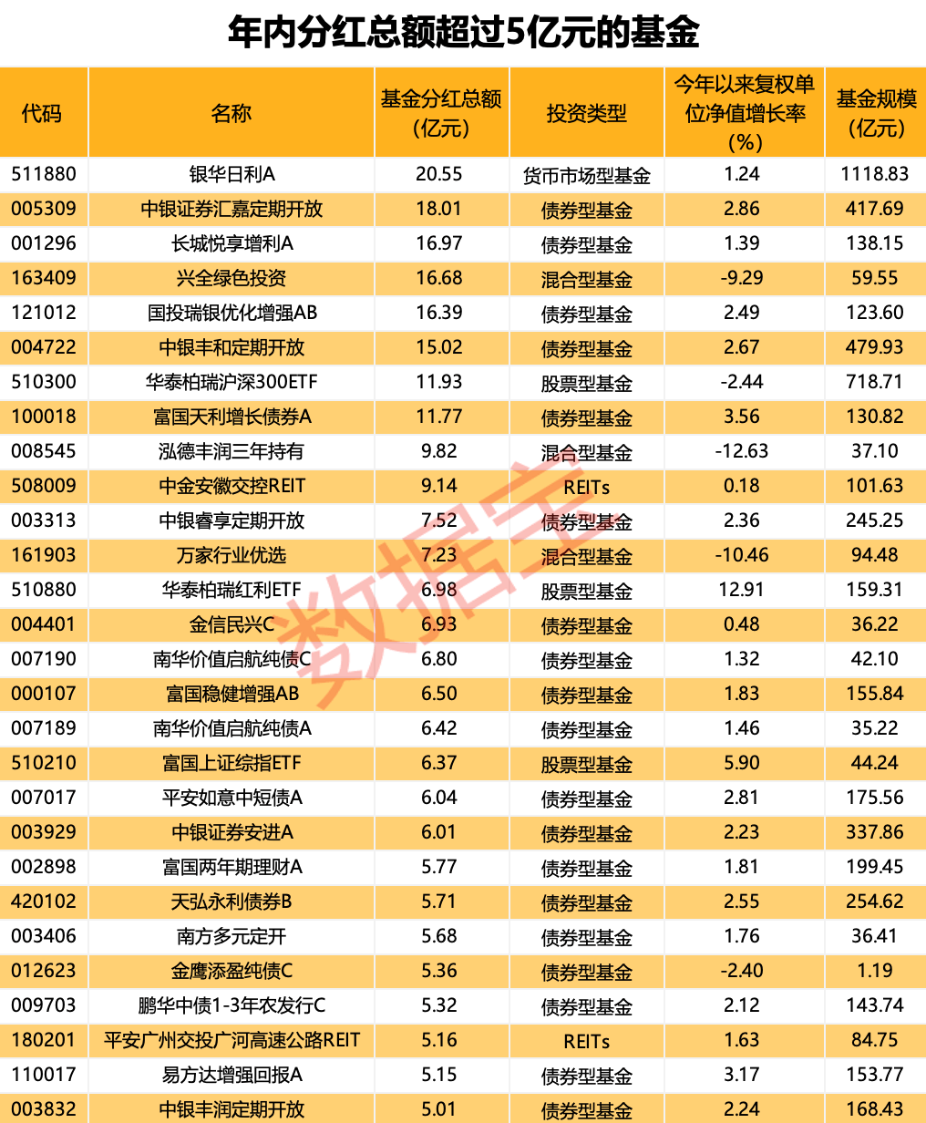 统计显示,以红利发放日为基准,今年以来共有28只基金分红金额在5亿元以上,以债券型基金为主,其中8只基金分红总额超过10亿元,这些基金最新规模多数在百亿元以上。