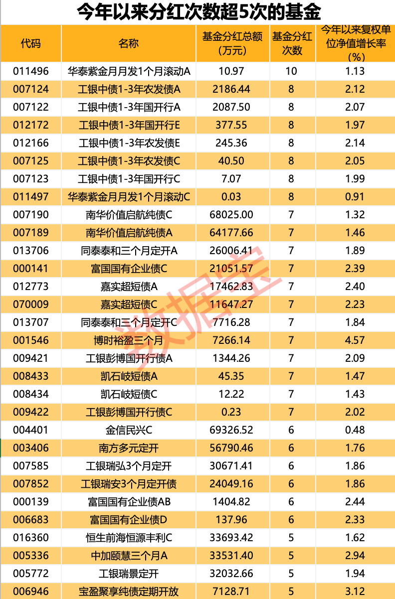 以基金红利发放日计算,统计显示,30只基金年内已累计分红5次以上,均为债券型基金,华泰紫金月月发1个月滚动A分红总数达到10次,工银中债1-3年农发债A、工银中债1-3年国开行A、华泰紫金月月发1个月滚动C等分红总额达到8次。