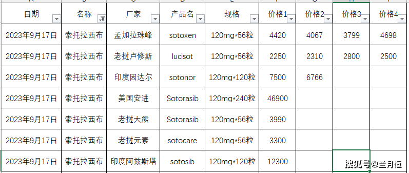 下图是靶向药价格监测员在境外各大网站收集的关于索托拉西布的价格,供各位参考。我们可以看到价格还是相差很大。