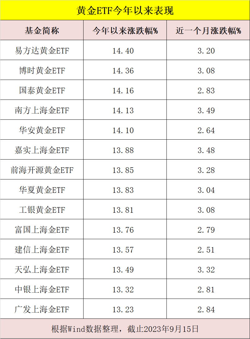 近一个月来,黄金类ETF涨幅较为明显。Wind数据显示,截至9月15日,近一个月,华安黄金ETF、国泰黄金ETF、易方达黄金ETF、博时黄金ETF等14只黄金类ETF涨幅超过2.75%;多只投资上海黄 金交易所Au99.99的黄金ETF,今年以来收益率都达到13%、14%左右。