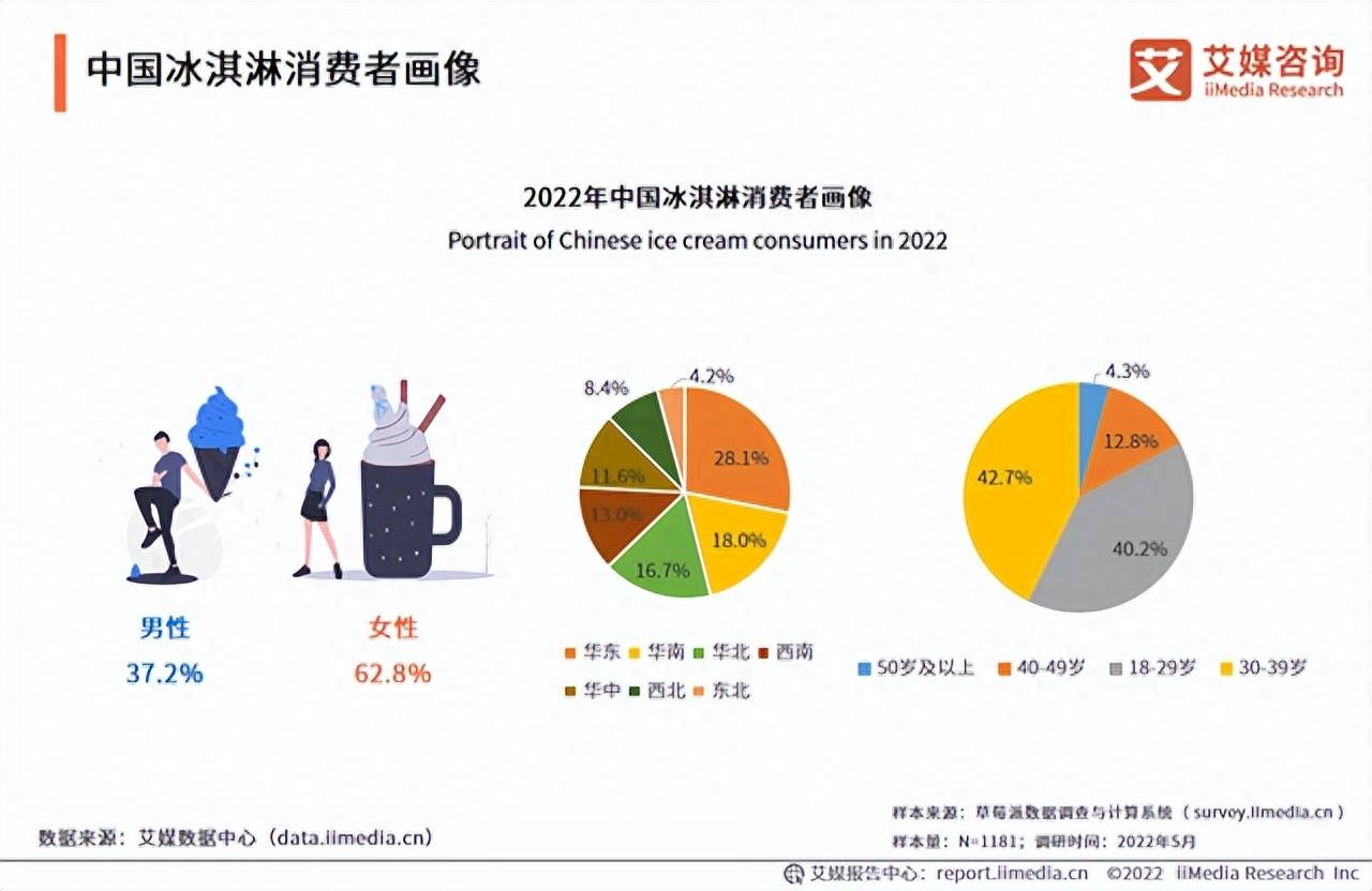 以冰淇淋为例,根据艾媒咨询的数据显示,2022年中国冰淇淋消费者画像中,女性是冰淇淋消费的主力军,占比62.8%,而从年龄分布上来看,则以18-29岁、30-39岁的中青年群体为主,占比均超过四成。