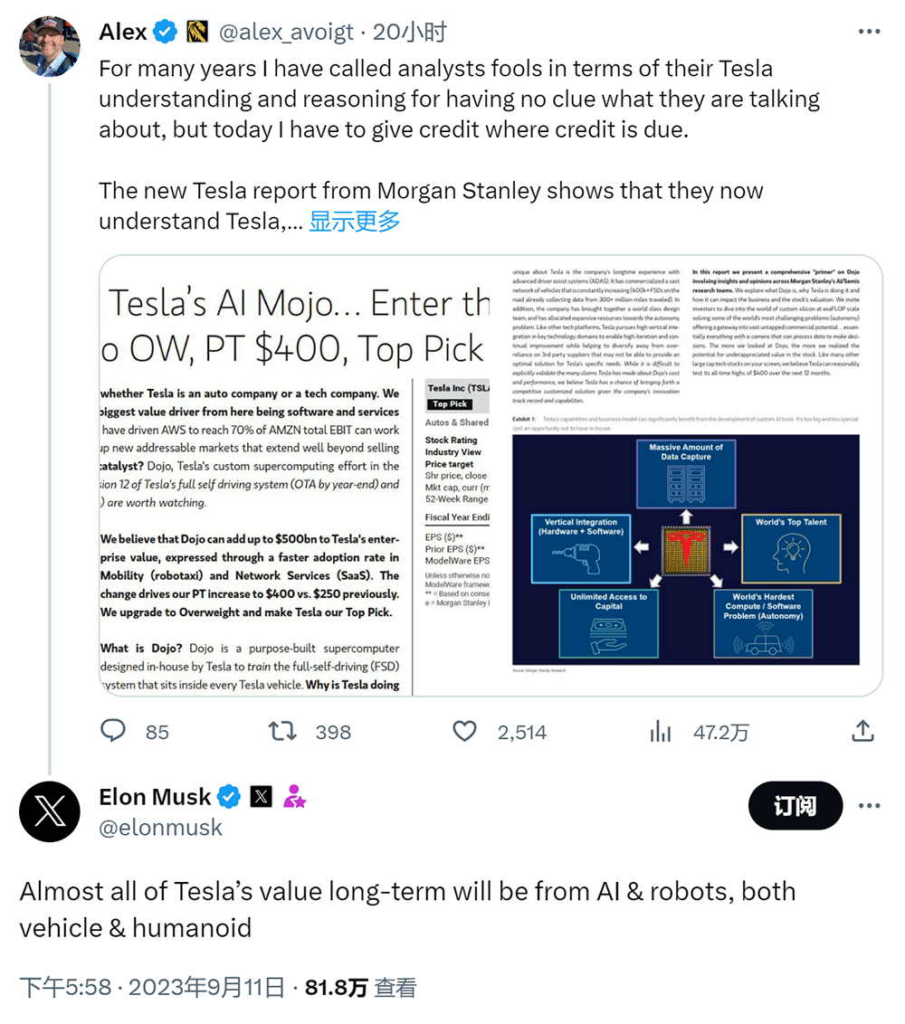 9月12日消息,9月11日,德国工程师Alex Avoigt在社交媒体X上发帖,称赞摩根士丹利最新报告将特斯拉定位为AI公司,认为这是一个积极的信号。马斯克在该贴下回复称:“特斯拉的长期价值几乎全部来自AI和机器人,包括车辆和人形机器人。”此前,摩根士丹利的一份报告认为Dojo超级计算机将为特斯拉带来近6000亿美元的市值增长。