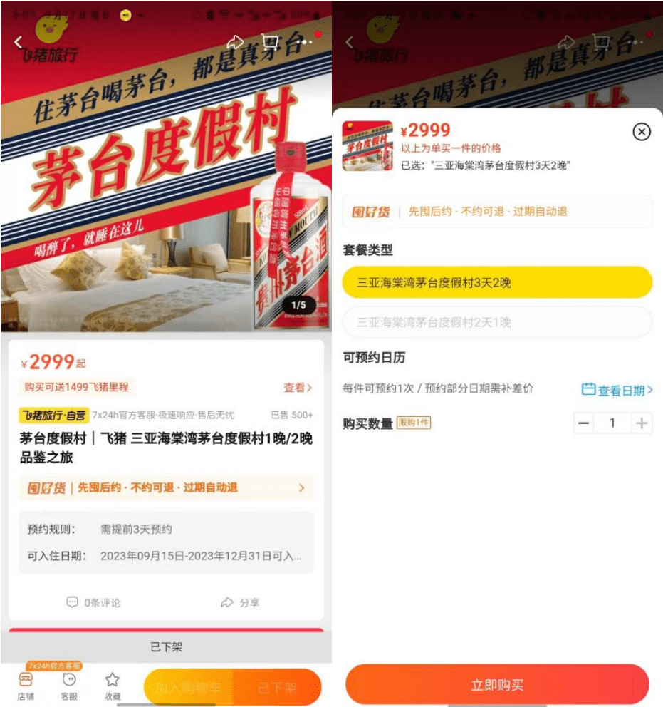 这个周末,“住酒店喝茅台”的消息刷屏文旅圈。飞猪方面给出的宣传文案很直接:“购买三亚茅台度假村指定套餐,飞猪请您尊享品鉴53%vol 500ml飞天茅台酒1瓶(1晚套餐另加1瓶茅台干红)。”