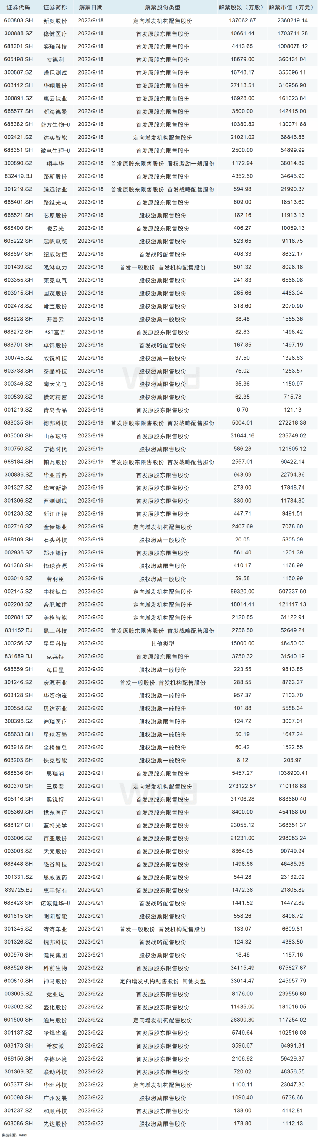从解禁市值来看,9月18日是解禁高峰期,31家公司解禁市值合计684.32亿元,占下周解禁规模的48.82%。按9月15日收盘价计算,解禁市值居前三位的是:新奥股份(236.02亿元)、稳健医疗(170.37亿元)、思瑞浦(103.89亿元)。从个股的解禁量看,解禁股数居前三位的是:三房巷(27.31亿股)、新奥股份(13.71亿股)、中核钛白(8.93亿股)。