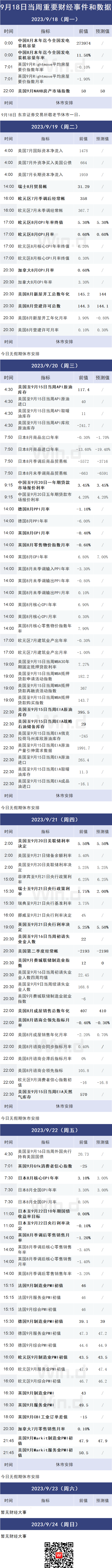 8、美国FOMC利率决策将公布,美联储主席鲍威尔将召开货币政策新闻发布会,美国将公布9月16日当周首次申请失业救济人数;日本央行将公布利率决议和前景展望报告,日本央行将召开货币政策新闻发布会;英国央行将公布政策利率;欧元区8月调和CPI同比终值与欧元区9月制造业PMI初值将公布。