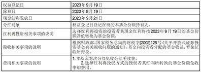 3、选择红利再投资方式的投资者所转换的基金份额将以2023年9月19日的基金份额净值为计算基准确定再投资份额,红利再投资所转换的基金份额于2023年9月20日直接划入其基金账户,2023年9月21日起投资者可以查询本次分红情况。