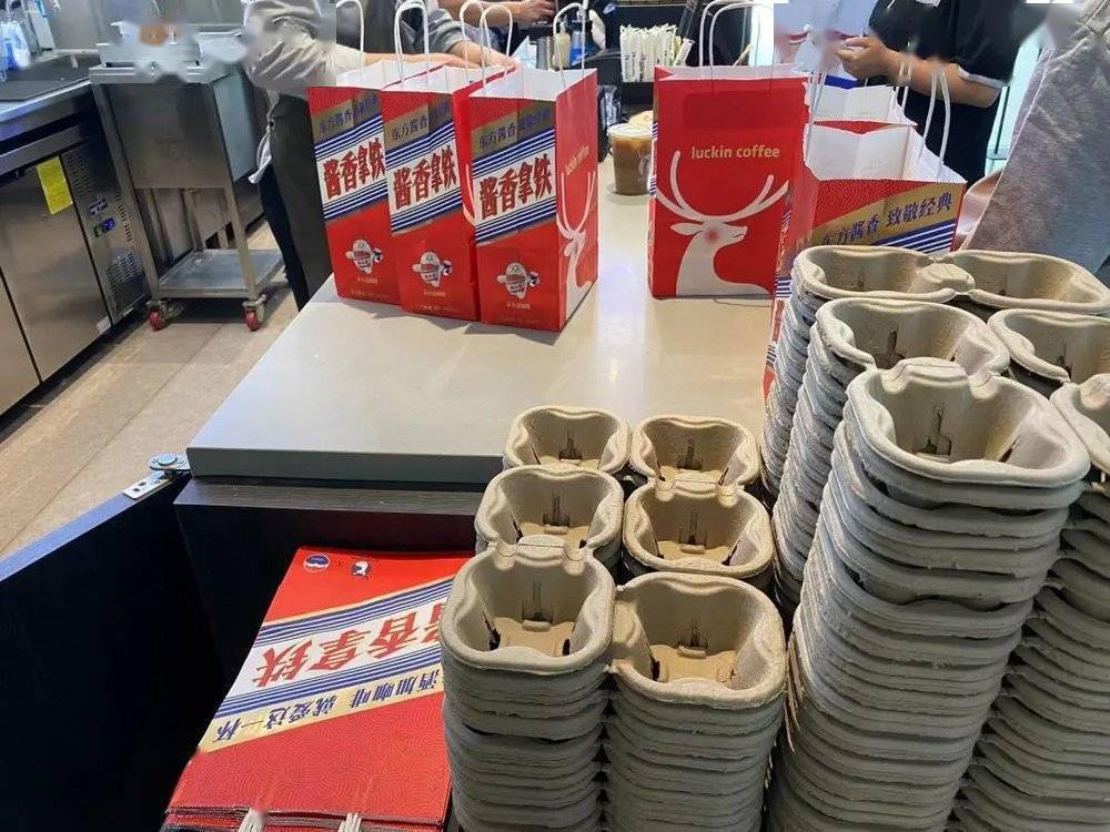 北京一瑞幸门店内,酱香拿铁的纸袋装着美式或生椰拿铁/豹变