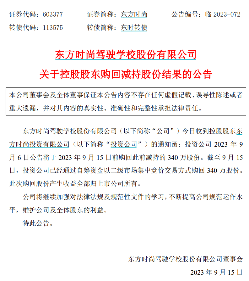 9月6日晚,东方时尚进一步公告称,东方时尚投资将通过自筹资金于9月15日前购回此部分减持的股份,若此部分股份购回涉及收益所得将全部归上市公司所有。