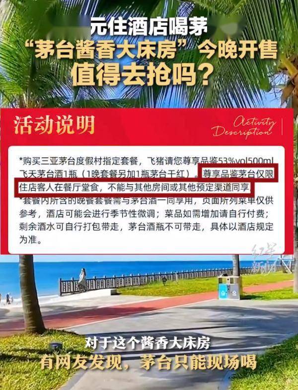 按照飞猪发布的信息,此次特价包括酒店的餐饮和现场品鉴飞天茅台。记者查询发现,该酒店大床房型平时不含飞天茅台,价格600元左右。值得注意的是,飞猪海报在活动规则处注明,999元入住套餐只有10个专享名额,2999元高级/大床房2晚套餐则没有标注名额限制。