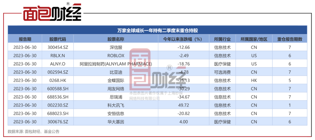 持股方面,万家全球成长一年持有期混合(QDII)重仓股持有期较长。基金主要持有A股和港股的计算机软件和半导体公司,以及美股的生物技术公司为主。二季度,基金前十大重仓股中仅新进科大讯飞。