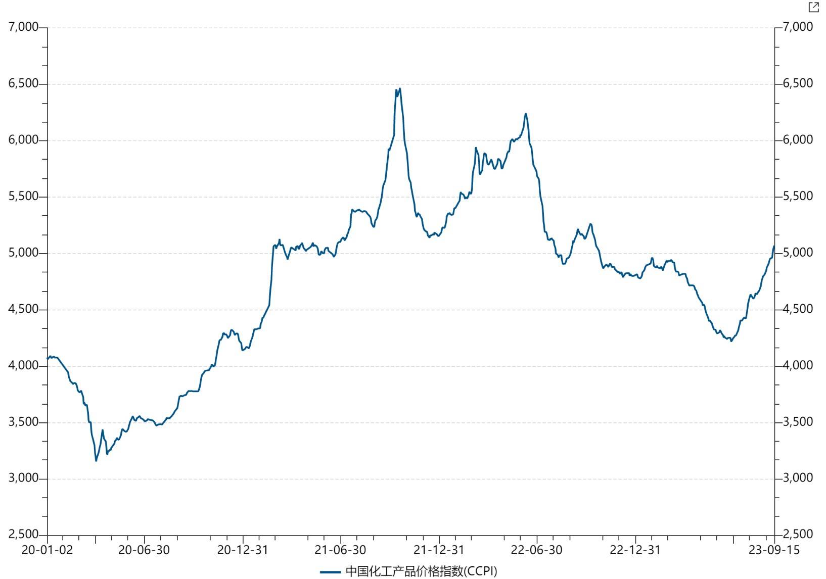 截至9月15日,化工产品价格指数CCPI升至5069点,较7月底上涨10%,自 6月27日触底回升以来涨幅高达20%。