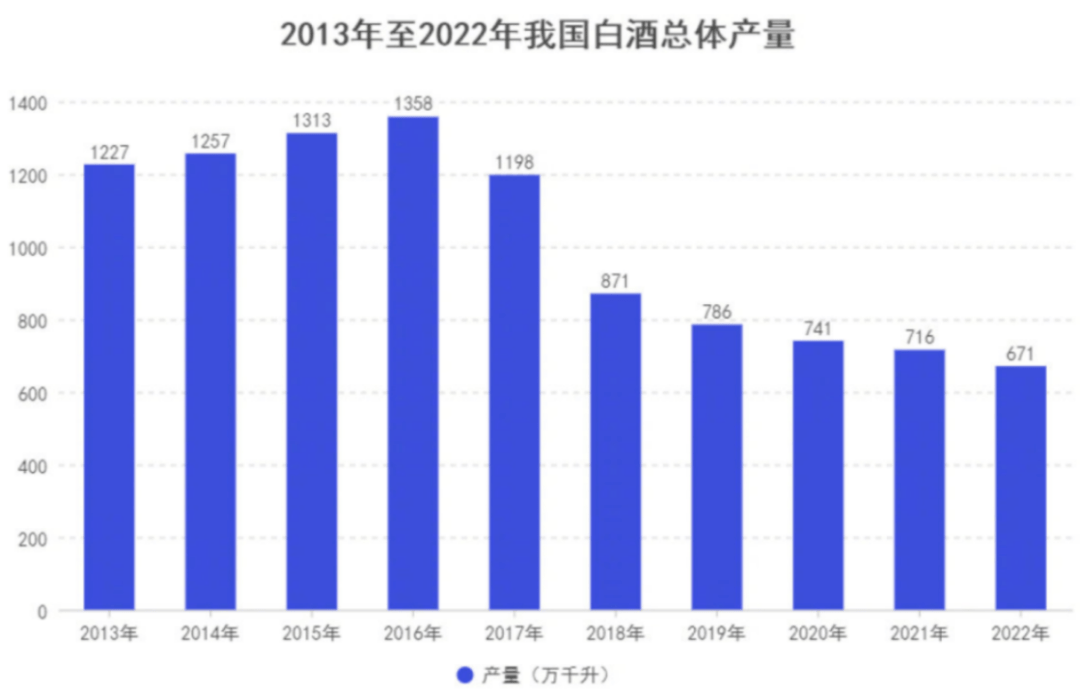 在中国,茅台与其他酒类的地位有些不同。但这毕竟是过去,很显然,当下的消费环境已经变了,看看最近几年中国白酒的相关数据就能发现问题。远的不说,2016年以前,中国白酒的产量还在稳步增长,2016年产量还曾达过1358万千升。2016年仿佛一道分水岭,因为从那一年开始,白酒的产量逐年下滑,到了2022年,只剩下671万千升产量,相较于2016年,几近赤祼祼的腰斩。