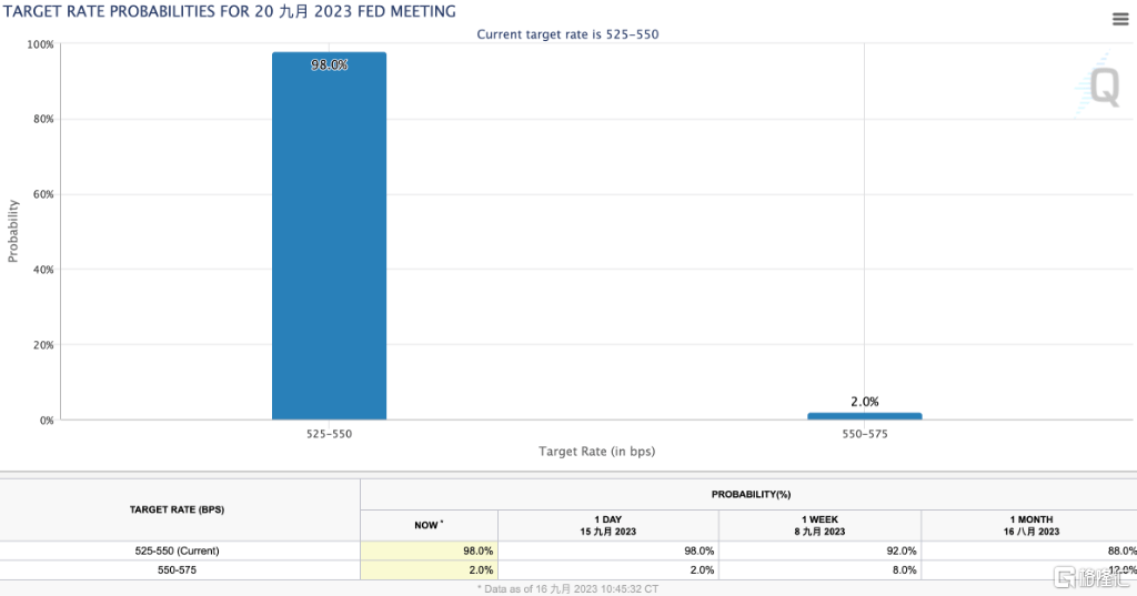 值得关注的是,芝商所美联储观察工具显示,9月暂停加息几乎“板上钉钉”的事件,概率高达98%,11月或12月加息25基点的概率在60%左右。