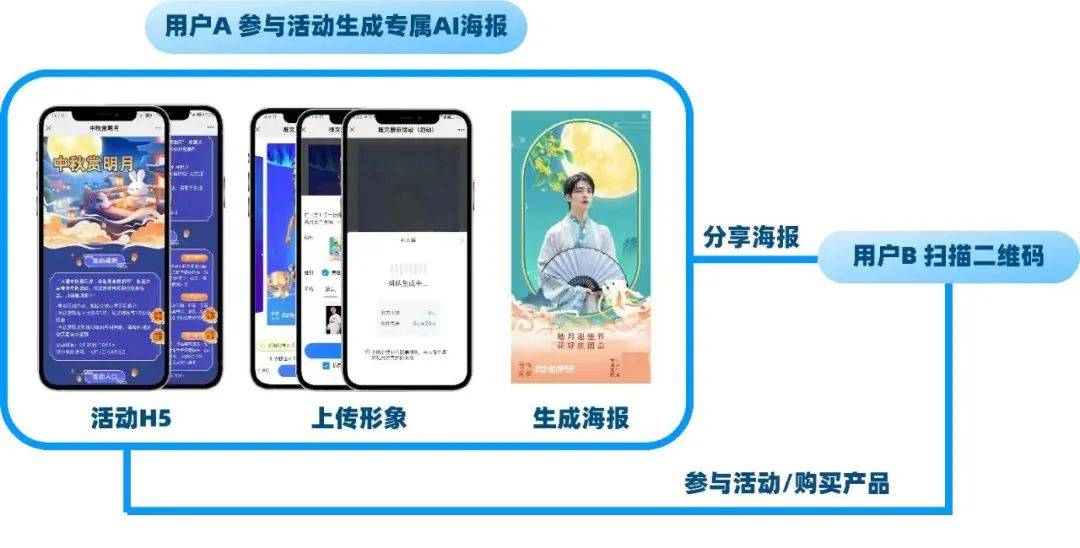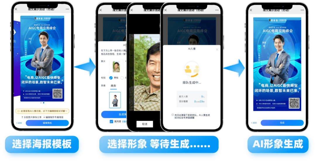 微媒结合之前主办方常用的传播海报模块,推出【AI换脸】的活动裂变海报,“以前是设计师为嘉宾定制海报,普通参会者没有特别强的传播意愿,因为他的形象没嘉宾那么优质,现在我们通过AI给他生成有商务感的高端海报,能促进用户分享。”