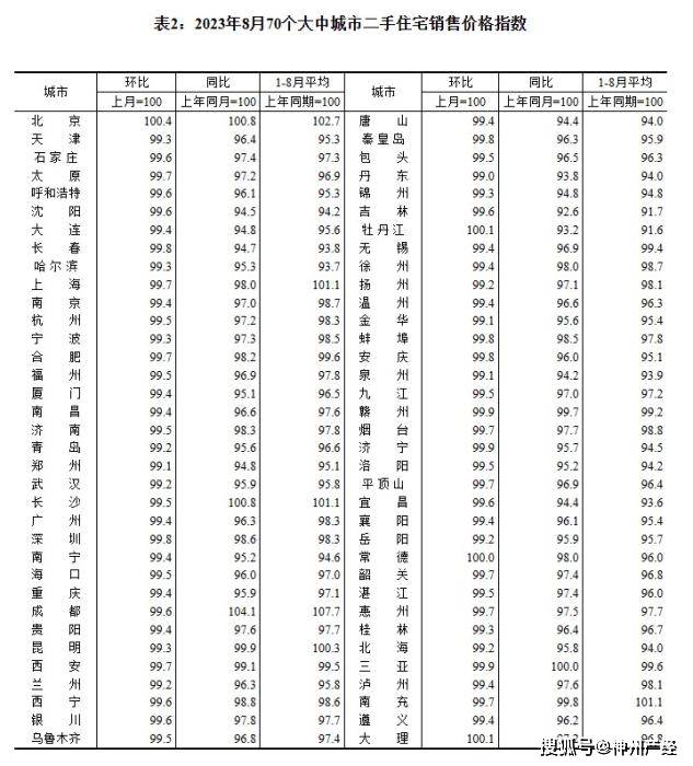 2023年8月70个大中城市二手住宅销售价格指数。 截图自国家统计局官网