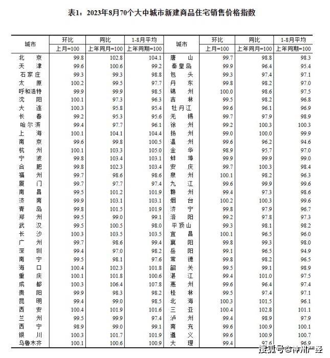 2023年8月70个大中城市新建商品住宅销售价格指数。 截图自国家统计局官网