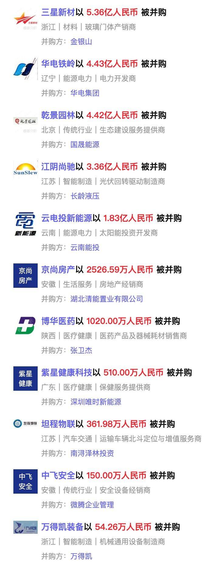 本周国内披露已完成的并购事件14个,与上周相比增加1个,分布在汽车交通、医疗健康、智能制造行业。其中,金银山以5.36亿人民币收购玻璃门体产销商三星新材14.15%股份。被收购方浙江三星新材股份有限公司是主要从事各类低温储藏设备玻璃门体及家电玻璃的设计、研发、生产与销售。公司的玻璃门体主要应用于冷柜、酒柜、展示柜和冰箱等,家电玻璃产品主要应用于冰箱,作为其外饰面和层架玻璃等。曾获得山西证券、广杰投资等机构投资。