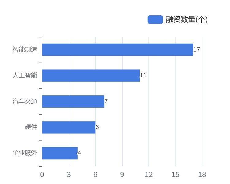 从融资事件数量来看,本周智能制造、人工智能、汽车交通领域融资最活跃。分别为智能制造17个、人工智能11个、汽车交通7个。
