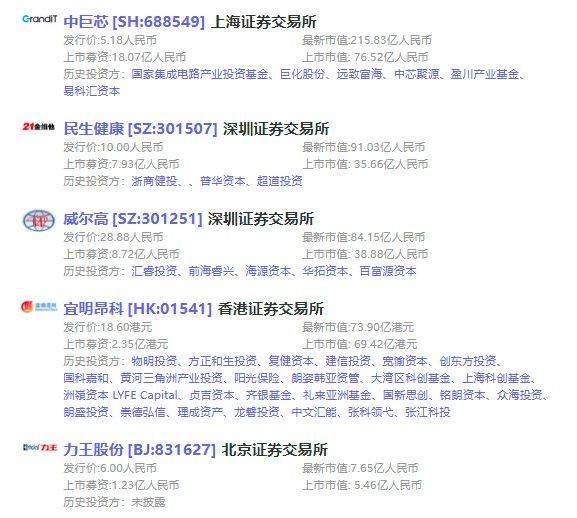5家上市公司中,有4家曾获VC/PE或CVC投资,其中「中巨芯」曾获中芯聚源、远致富海、易科汇资本投资;「民生健康」曾获普华资本、浙商健投、超道投资投资;「威尔高」曾获百富源资本、前海睿兴、华拓资本投资。