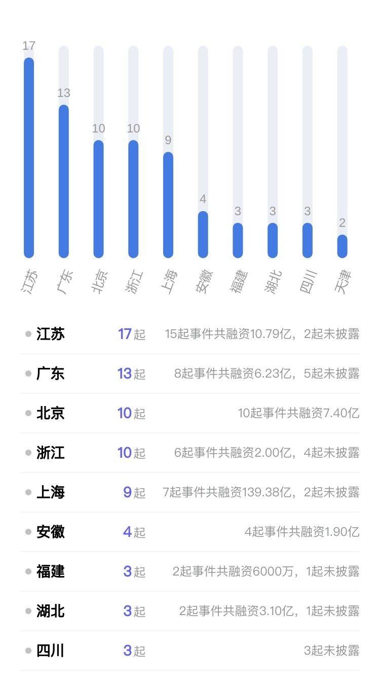 从本周披露获投企业的地区分布来看,主要集中在江苏、广东、北京。其中江苏披露17个,广东披露13个,北京披露10个。