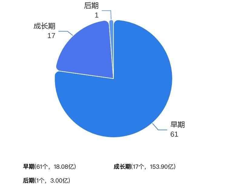 从本周披露获投企业的阶段分布来看, 早期61个、成长期17个、后期1个。