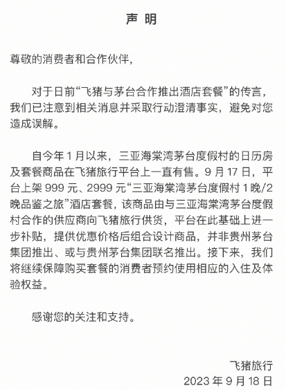 飞猪在公告中称,自今年1月以来,三亚海棠湾茅台度假村的日历房及套餐商品在飞猪旅行平台上一直有售。9 月17日,平台上架 999 元、2999 元“三亚海棠湾茅台度假村 1晚/2晚品鉴之旅”酒店套餐,该商品由与三亚海棠湾茅台度假村合作的供应商向飞猪旅行供货,平台在此基础上进一步补贴,提供优惠价格后组合设计商品,并非贵州茅台集团推出、或与贵州茅台集团联名推出。