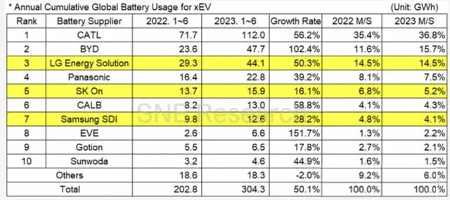2023年上半年动力电池全球装机量