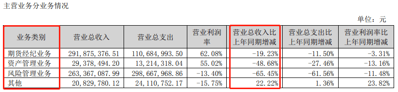 从主营业务来看,报告期内,该公司期货经纪业务实现营业收入2.92亿元,较上年同期下降19.23%;资产管理业务实现营业收入2937.85万元,较上年同期下降48.68%;风险管理业务实现营业收入2.63亿元,较上年同期下降65.45%;其他业务实现营业收入2082.98万元,较上年同期增长22.22%。